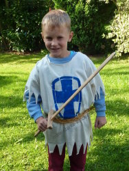 Sehr schnell hat man auf diese Weise auch ein mittelalterliches Gewand für die Kinder gezaubert, indem man von einem naturfarbenen T-shirt den Kragen, die Ärmel und den Saum unten fransig ausschneidet, mit Textilmalerei ein Wappen auf die Vorderseite malt und ein Seil zum umbinden benutzt.